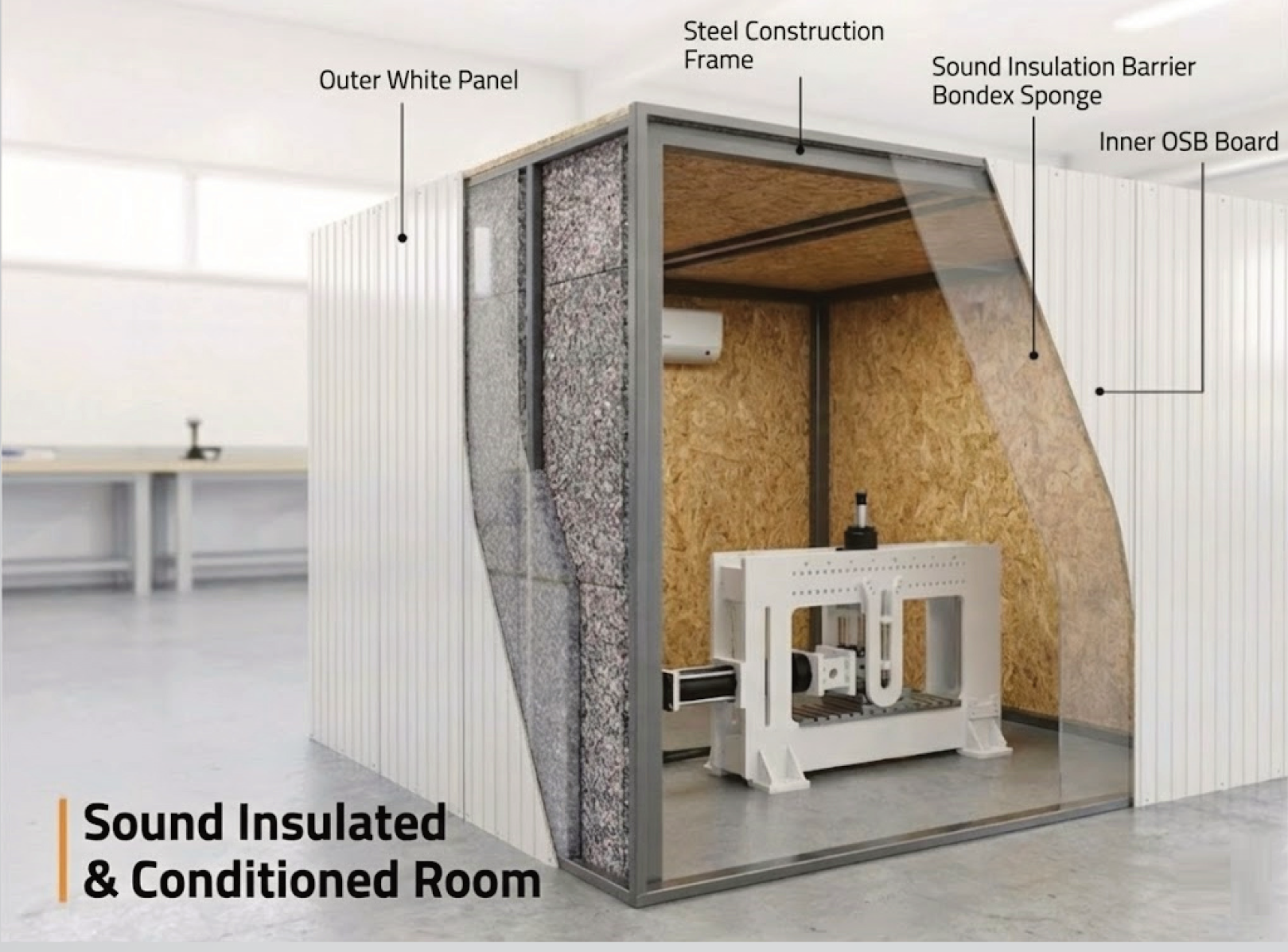 Sistem, laboratuvar güvenliği ve test sonucu stabilitesini sağlamak amacıyla ses yalıtımlı ve termal olarak koşullandırılmış özel bir odaya entegre edilebilir.
